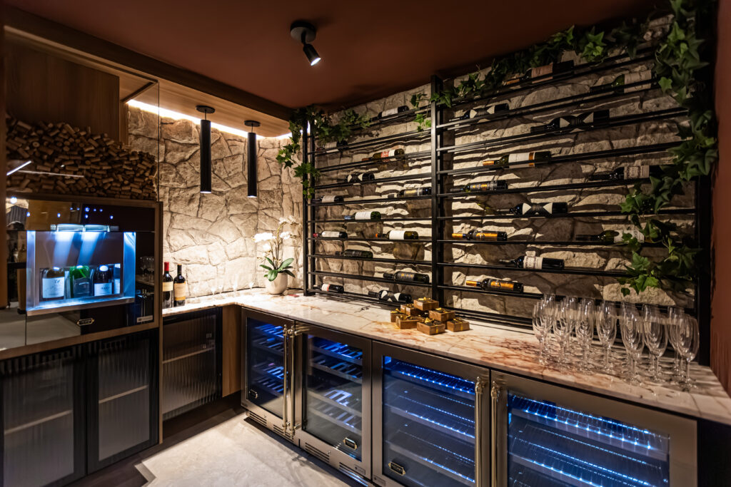 A parede da adega recebeu revestimento em Pedra Núvola Branca fornecida por nós da PEDRACOTA, cuja textura natural se contrapõe aos acabamentos refinados, valorizando a autenticidade do espaço. O resultado é um ambiente elegante e acolhedor, perfeito para encontros em clima intimista.