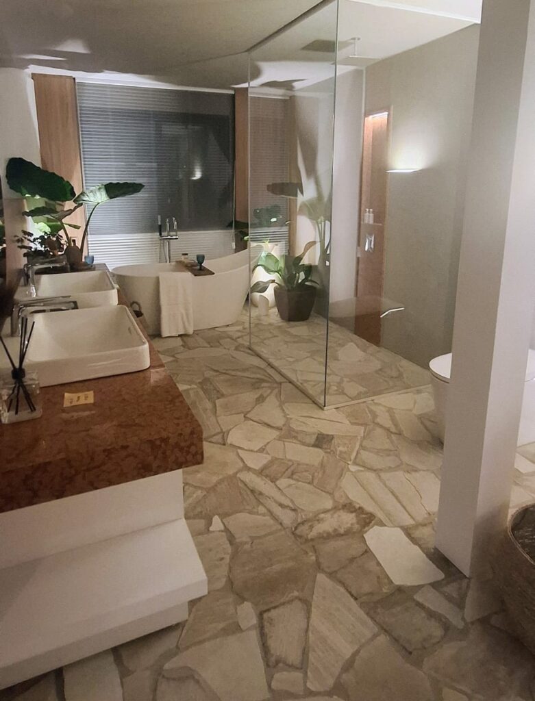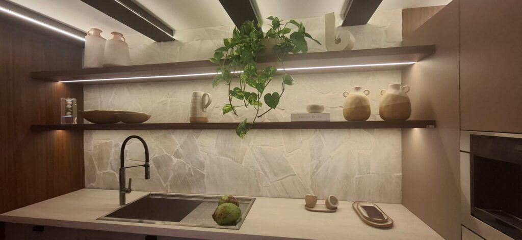 A integração entre tecnologia, revestimentos naturais e soluções de design faz também deste ambiente um exemplo de como as pedras naturais valorizam o uso diário sem abrir mão da sofisticação.