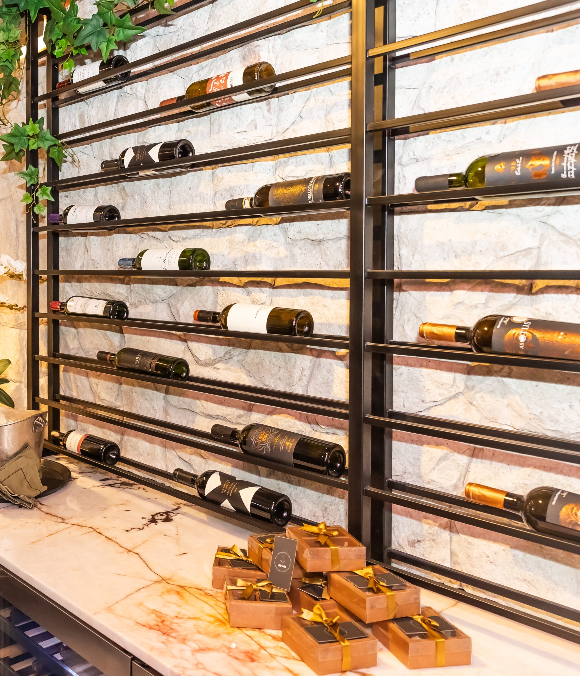 A parede da adega recebeu revestimento em Pedra Núvola Branca fornecida por nós da PEDRACOTA, cuja textura natural se contrapõe aos acabamentos refinados, valorizando a autenticidade do espaço. O resultado é um ambiente elegante e acolhedor, perfeito para encontros em clima intimista.